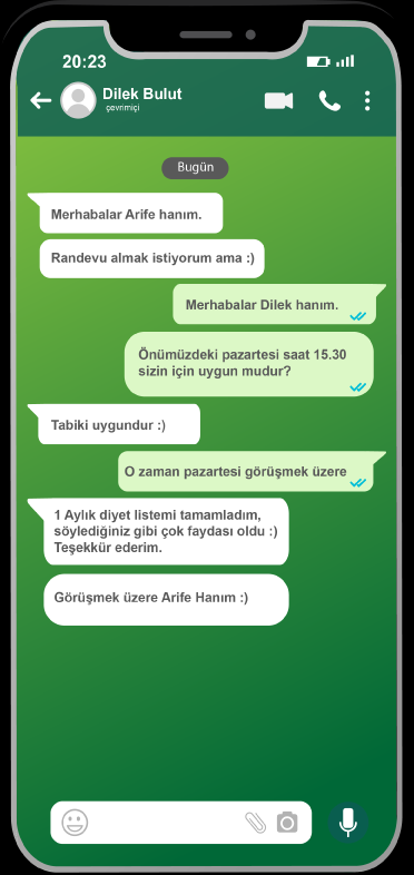 “İnternet araştırmalarım sonucu karar verdiğim ve gittigim ilk andan itibaren bilgilendirmeleriyle bana güven veren başladığım sürece kolay adapte olmamı sağlayan ilgili bir diyetisyen. Ne zaman isterseniz ulaşıp aklınıza takılanı sorabiliyorsunuz.”